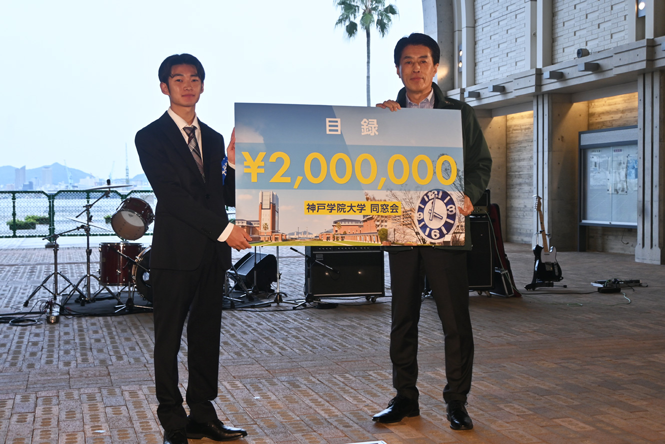 友情の輪を広げ、心に響く感動の大学祭を創りあげようという意味がこのテーマには込められています。大学祭運営に際し、同窓会から大学祭運営支援金を贈呈いただき、オープニングセレモニーでは、同窓会の桑原理哲会長から大学祭中央実行委員会の玉岡流星・第58代会長(経営学部3年次生)へ目録が授与されました。この度もご支援を賜り御礼申しあげます。